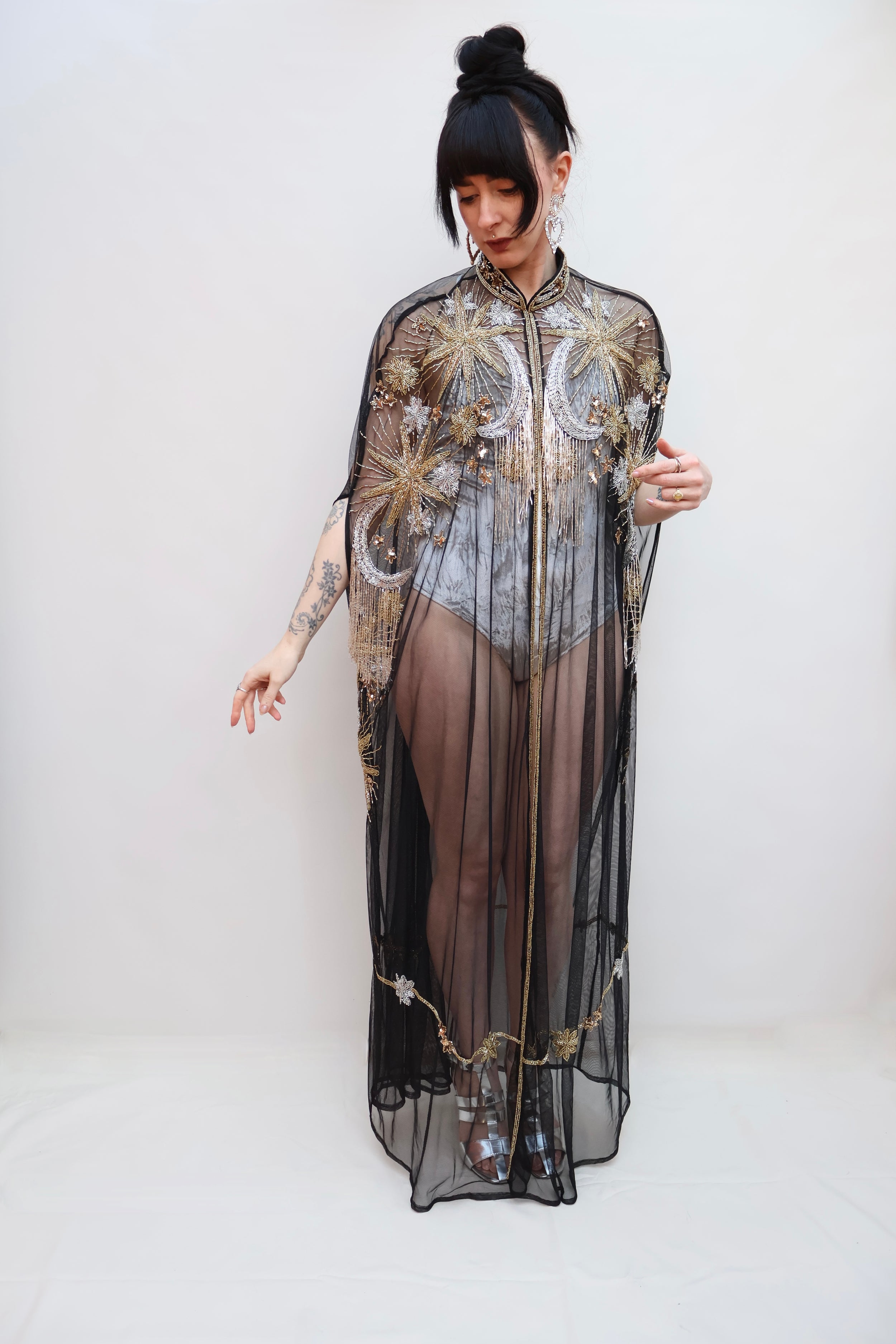 Wow... My most magical creation to date! This stunning vintage style floor length celestial cape features a beautiful star and moon pattern. The stars and moons have been hand created using silver and gold beads. This a heavily beaded cape, so drapes beautifully but is still very comfortable to wear. It has two fastenings, one at the neck, and another further down at the front. It also has hidden openings at the side so the arms can come through at the front.