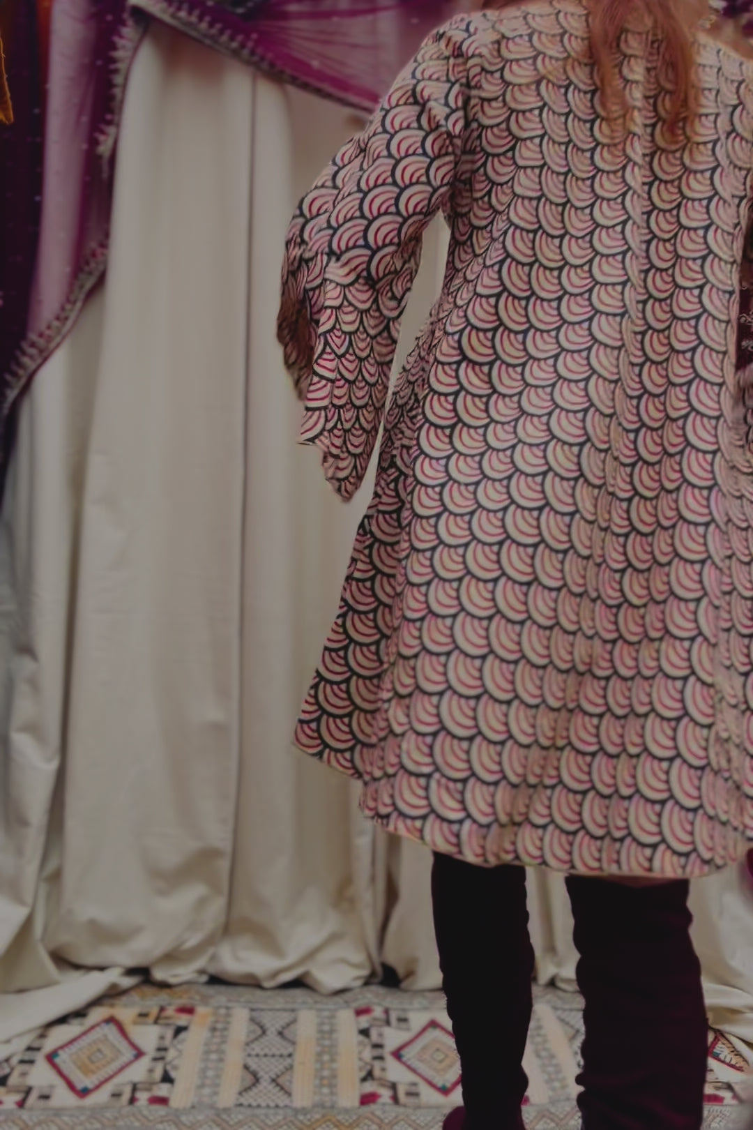 A gorgeous funky 70's style mini dress with flared bell sleeves. Made from a beautiful Indian block print cotton, and complete with lace up front detail and statement tassels! A perfect party dress made for all you bohemian babes.