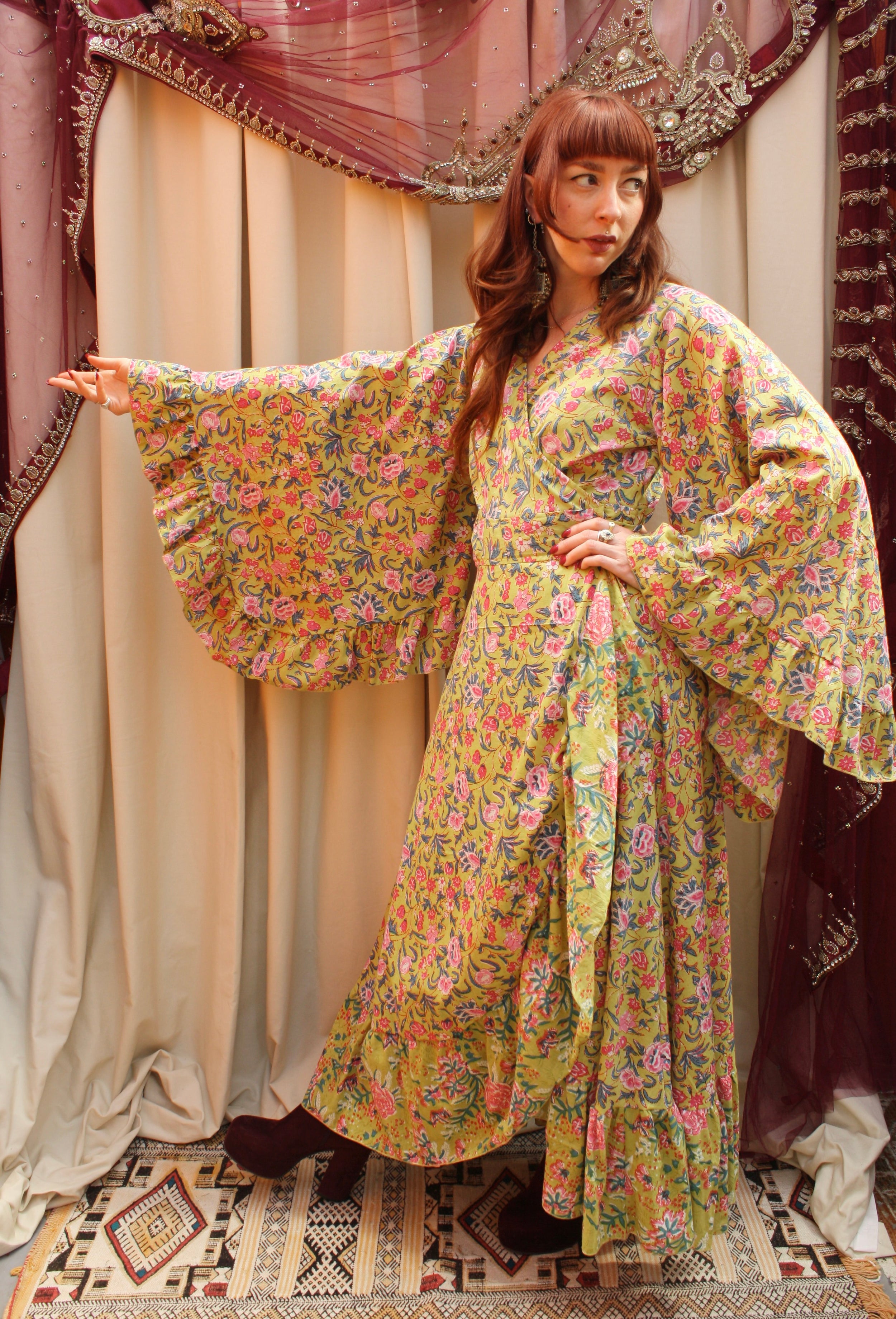 These 70's style wrap dresses are made from 100% luxurious Indian block printed cotton. Wrap dresses are always such a flattering fit, as you can tie them perfectly to fit your own unique body shape. These dresses feature dramatic bell sleeves, very 'Stevie-esque' and perfect for festivals, holidays in the sunshine or anywhere you want to feel like a bohemian goddess! I also love the look of these undone to be worn as a kimono, as you can tie it at the front as both sides are symmetrical! A multifunctional chic addition to your wardrobe. This dress is available in 3 different patterns, please check out my website to see all patterns available :)